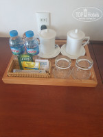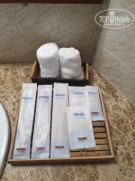 Каждый день две бутылочки воды по 350гр, кофе, зеленый чай, конфетки. Чайник есть. Утюга нет. Мест для сушки купальников нет. Пляжные полотенца меняют либо во время уборки, либо вечером. Шлепки в номере вроде одноразовые, но сопровождающий от туроператора сказал, что их нужно оставлять (если кто-то хочет взять на память) Номер сдается чуть заранее, при выселение его проверяют.