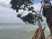 Вот тут, печально. На момент нахождения в отеле, пляж был только с левой стороны (если стоять лицом к морю). Центральная и правая часть (около 3 корпуса)-берег сильно размыт бар стоит на обрыве и деревья некоторые накренились или упали (все сразу убирают). Над укреплением берега активно работают: сетки с камнями, брезент, в отлив заезжает экскаватор и нагребает песок, но море побеждает тк всю неделю штормило. Волны сильные, все время черный флаг. Только один день, самые отчаянные пытались искупаться.