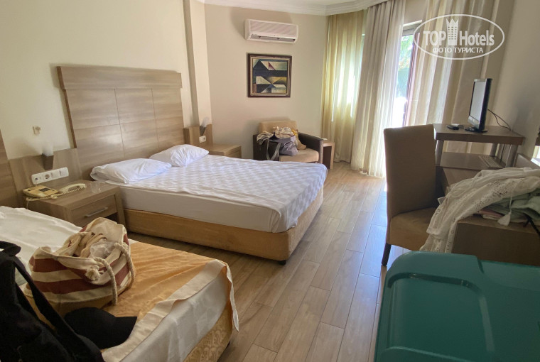 Приехали в итоге в отель в 04:00 утра, на ресепшн встретил молодой парень, мою просьбу разместить в новом корпусе с тихой стороны проигнорировал, улыбнувшись и сказав "подойдете с утра, там все решим", супер, учитывая что его смена в это время заканчивается. Дали нам номер 4103, в небольшом круглом здании присоединяющийся к основному корпусу, он двухкомнатный, НО, микроскопический, в прихожей не развернуться, а комната с двухъярусной кроватью больше похожа на казарму площадью не более 3кв.м., и основной минус этого номера, окна выходят на бар и сторону амфитеатра, шум соответственно будет сопровождать с раннего утра и до ночи(поскольку дискотеки тут до 23:00 минимум). Мы переночевали в нем и с утра пошли просить замену на стандарт(который положен по путевке), и тут нас уже встречала крайне недовольная и озлобленная Виолетта, на мою просьбу дать другой номер, да и еще в новом корпусе(вы что), отреагировала крайне остро и агрессивно, и пригрозила что мол если скажет управляющему , то нас переселят вообще в сторону дороги. В общем не буду дальше вдаваться в подробности нашего диалога, но в ходе него нам дали возможность выбрать номер в новом корпусе (типа с апгрейдом с 2х ярусной кроватью) за 40$, либо стандарт без доплат в основном корпусе.