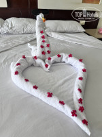 Номер: в Египте не первый раз, зная их зарплаты, мне не жалко было дать 20$ за свой комфорт (опять же начиталась отзывов про номера, и с детьми не хотелось ходить и высматривать лучше). Произошёл этакий баш на баш) Номер 332, второй этаж главного корпуса, окна панорамные, балкона нет, одежду есть где сушить. К сожалению не пофоткала, но мне кажется похожий номер был где-то в отзывах. Так вот за 20$ был хороший телевизор, правда там только 1 русский канал, но дочь смотрела мультики на арабском) новый холодильник, новый чайник, утюг должны были принести, но я отказалась потом, поняла что не хочу ничего утюжить, мне дома этого хватает) мебель где-то царапанная, где-то грязноватая, но мне норм было, матрасы чистые, попросила поменять постельное (начиталась что дают из под прошлых отдыхающих) оно было чистое, но вбила себе в голову и попросила поменять все, заодно и полы мне помыли просто так ещё раз. Принесли комплимент в номер кофе, чай, сахар, стаканчики, ложки, фрукты и ещё воды плюс к той что дали при заселении, нашим друзьям все то же самое, только номер был с балконом у них. Уборщик был хороший у нас, оставляли по $, крутил полотенца, менял их каждый день, украшал кровать и розы подарил. Сантехника староватая, в принципе, сама ванна старенькая, но чистая. Мыло всегда пополняли, шампуни, бумажные салфетки для лица и бумагу. Сейфом не пользовались. Вид из окна супер. Но если с детьми шумно не только детям, но и нам, тк музыка на бассейне включалась именно в обед. И анимация когда была с 21-23:00 музыка была на всю))) Выбирайте комнаты на сад, кто не любит шум. Иногда меня напрягало это, дочь спала без проблем.
