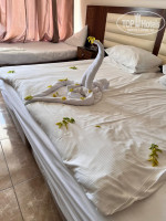 Добрый день. В отеле была вместе с супругом с 28.09.2024 по 08.10.2024. Приехали специально, провести моё день рождение. Заселили после 14.00, номер с видом на бассейн, как и покупали изначально путевку. Номер староват конечно, телефон не работал, но нам и не нужен он был. Потом каким-то образом это выяснили и забрали аппарат на ремонт. Отремонтированный вернули на место, но мы телефоном не пользовались. Светильник не работал, попросила поменять лампочку. В туалете раковина черная, номер 2151, черная плесень по краям. В душевой тоже плесень и неприятный запах выходит из слива. На ночь дверь приходилось закрывать, чтобы не дышать этим запахом. Никуда не ходила, никому не жаловалась. Море...... его там нет((( Он есть, но купаться нельзя до обеда каждый день, иногда и после обеда. Я об этом конечно не знала. Это оказалось неприятным открытием. Затем 7 октября, настал день моего рождения. Муж заранее забронировал ресторан а ля-карт по 25$ на каждого. По приходу выяснилась, что напитки только местные, такие же как в основных ресторанах. Меню очень скудное, и тоже всё практически тоже самое, что и в других ресторанах, честно, я так и не поняла, за что мы заплатили 50$. При бронировании столика муж проговаривал о моём дне рождении, но ни кто меня так и не поздравил. Когда все было "съедено", муж пошел уточнять, узнавать где мои поздравления и где торт, он тоже ничего не понял. А я как женщина, просто не справилась со своими эмоциями, от испорченного дня рождения и просто расплакалась от обиды и досады. Абсолютно не вкусный ужин, ужасная выпивка и никаких поздравлений. Я просто встала и ушла в номер. В 21.20 в номер постучали и принесли торт, сказали отправил ресторан. Вот так я провела своё ДР... проплакала до 2-х часов ночи. Снова в этот отель я не вернусь ни за что на свете!!! Это как в анекдоте с сервизом. Поэтому я просто хочу забыть этот отдых... Кстати добавлю, за 11 дней ни рау не давали манго, хотя самый сезон в Египте. И питание было одно и тоже в каждом ресторане. Голодные не ходили, но и вкусно не было.