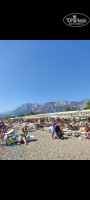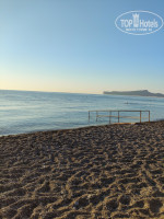Территория пляжа небольшая,у кого ноги чувствительные -берите тапки.Пирса нет,заход не очень приятный для многих,есть только перила,но без элементарных досок,ногами все равно по гальке ходишь.
