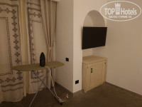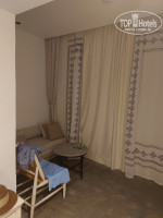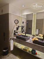 Площадь полулюкса 43 кв.м. Дэлюкс примерно 40 кв.м Номер состоит из коридорчика, спальни с выходом во дворик, небольшой гостиной с диванчиком и выходом во дворик, туалет и душ в одном помещении. Номер в стиле лофт, везде бетон и дерево. Очень симпатичные номера, бетон не смущал, но был пыльноват местами. В номере 2 телевизора, есть 5-7 русских каналов. Кондиционер в гостиной + выведен в спальню, но его можно не включать. Мы включали в гостиной и он полностью охлаждал номер. Есть бесплатный минибар с напитками (сок, вода мин., лимонады, тоник, пиво). При заезде в номере было 3 яблока и печенье макаронс. Есть чайник, чай, кофе, сахар, посуда. В туалете 2 раковины, большое зеркало, душ, фен, банные принадлежности, халаты.