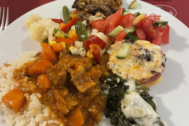 Питание не для привередливых,завтрак каждый день один и тот же,отварные яица,остывший омлет,булочки,масло,овощи и фрукты(которые быстро разбирались и новое не выносили).Обед и ужин конечно очень вкусный ,повар молодец,сам обслуживал зал,помогал официантам,ему уважение и признание!Реально еда очень простая,но очень вкусная,по домашнему.Курица,говядина индейка,котлетки,рыба,овощи пареные,жареные,свежие,гарнир всегда рис,макароны,картофель.Вкусно.НО есть большое НО!были мы в конце октября,но по ощущениям это был разгар сезона,тк людей в отеле очень много и из-за этого огромные очереди в ресторане за едой.Я такое вижу впервые,это напрягало конечно,не комфортно себя чувствуешь.