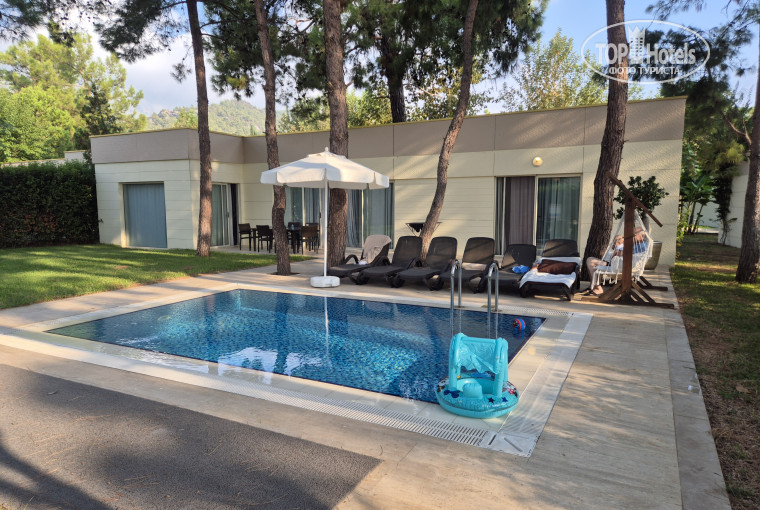 Поехали большой семьёй на 10 дней . В отель прибыли в обед. Приветственное шампанское и быстрое оформление. Изначально были по туру один Family Room & 1 номер на 2+1 (ребёнок). На Ресепшен предложили виллу. Она не очень подходила по наш запрос. но когда рассмотрели что у нас в туре Family Room + номер виллу больше по размеру и со всем плюшками о которых только могли мечтать: Огороженная территория под соснами, свой бассейн ( правда в котором купался только я и то 1 раз), так как в 25 метрах море и в 5 метрах релакс бассейн ( Relax Pool 2) большего размера. Вилла состоит из Холла- Лобби ( очень большого и уютного для всех) , трёх комнат большого размера. В каждой комнате своя ванная (отличные халаты тапочки и все принадлежности в наличии)и даже джакуззи+ гардероб +сейф , чай. кофе минибар ( пополнялся ежедневно пивом напитками и мелочью). Так же на вилле была своя кухня с большим холодильником и плитой. Но не пользовались совсем. Во-первых не было необходимости (кроме хранения детского питания в холодильнике), а во-вторых нет посуды. Даже тарелок и бокалов ( была одна тарелочка и два бокала) И это единственный "минус" по вилле. удовольствия от виллы не описать словами. Это Нечто!