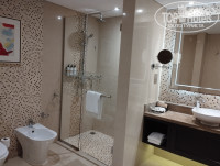 Добрый день, дорогие путешественники! Вернулись из отпуска и я решила написать отзыв по свежим воспоминаниям. Кто-то не так давно спросил, кто пишет положительные отзывы данному отелю? Это буду я) В ОАЭ впервые, сравнить именно в этой стране не с чем. В целом, отелем и отдыхом остались довольны! Приехали в отель около 10 утра, дорога от аэропорта заняла менее часа, ехали на микроавтобусе, было всего 6 человек. Сразу надели браслеты, заполнили документы, оплатили налог (отдельного депозита в отеле нет). Номер нам предоставили в районе 12 часов, отель заселяет раньше времени по готовности номеров, если есть свободные, то могут заселить сразу. В холле для гостей есть вода, холодный чай и арабский кофе. Изначально номер нам предоставили на первом этаже (фактически второй) с видом на сад и на море. На третий день номер поменяли по моей просьбе на третий этаж с видом на бассейн и внутренний двор. Объясню почему, напротив отеля идет стройка, укладывают коммуникации, делают дорогу, в этом отель, конечно, не виноват, но я просыпалась два дня ровно в 5 утра, как только начинала работать техника, хотя моя семья ничего не слышала, их полностью все устраивало. Я решила, что хочу высыпаться в отпуске и попросила замечательную девушку Ксению на ресепшен поменять номер, вот там была абсолютная тишина по утрам, только птицы пели. Номера фактически одинаковые, двухкомнатные, два санузла, с балконом, жили в № 121 и № 333. Все очень чисто, исправно работала сантехника, есть чайник, холодильник, фен где-то в ящике спрятан, сейф, утюг и два телевизора с русскими каналами. Переходники брали свои, подошли, но можно взять на ресепшен. В ванной есть мыло, шампунь, гель для душа, лосьон для тела и кондиционер для волос, все хорошего качества, хоть и брали свои, но пользовались местными. Ежедневно делали уборку, качественно, меняли полотенца, по три маленьких, средних, больших, два для ног. Постельное белье белоснежное, без пятен, меняли один раз. Кровать и подушки удобные, для ребенка раскладной диван. Кондиционеры в двух комнатах работали хорошо, но на ночь мы все же их выключали, не душно, спать комфортно. Халаты, тапочки, зубные щетки – по запросу, бесплатно. Воду можно просить без ограничений, принесут, сколько нужно, бутылки стеклянные и их нужно оставлять, за утерю штраф 40 дирхам. Чай, кофе, сахар, сливки – пополняют ежедневно. Большие балконы со столом и стульями, а вот сушилки нет, веревку можно взять свою) Сушили купальные принадлежности на стульях. Питание: для меня достойное, на завтраки жарят яичницу/омлет, панкейки, вафли, хороший сыр, грецкие орехи и миндаль, пакетированные соки, из фруктов были арбуз, дыня, яблоки, груши, грейпфруты, Обед и ужин несколько однообразные, но вкусно, можно выбрать, по два вида супов, была говядина, курица, печень, рыба - филе, кальмары резиновые, много гарниров, овощей, изумительный хумус. Пару раз просили поваров приготовить картофель фри, приносили горячий. Конечно, в сравнении с Турций и Египтом, может показаться скудновато, но нам всегда и всего хватало, десерты почти не пробовали, нет любителей, но крем-брюле и пишмание с фисташками оценили. Единственное, чего мне лично не хватило – это барбекю, хоть что-то приготовленное на открытом огне. Мороженое только платно, 20 дирхам. Кофе из кофемашин приличный, крепкий, насыщенный, да, часто заканчивалос
