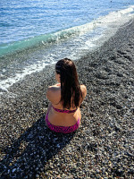 Есть пирс без лестницы. Море уже холодное, есть отчаянные кто купается. Пляж средняя галька, вход в корралках.
