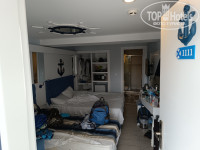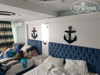 Нам выдали на каждый номер по 2 электронных ключа и карточки для пляжный полотенец и заселили в корпус № 1, номера данного корпуса на первом этаже располагались с выходом прямо к бассейну и с противоположной стороны бассейна. Наши номера располагались рядом № 1111 и № 1109 с прямым выходом к бассейну. Номера оказались небольшими по размерам, с низкими потолками. Две полутораспальные кровати, прикроватные тумбочки возле кроватей, раскладное кресло-кровать, журнальный столик, небольшой шкаф с отсеком для верхней одежды и три полочки для остальной одежды. На одной из полочек располагался платный сейф, а в нижнем отсеке располагался маленький холодильник. В холодильнике при заселении имелись баночки объемом 0,33л с разными напитками: кола, спрайт и др., а также 2 полуторалитровых бутылки воды без газа. Напротив кроватей на стене висел телевизор, зеркало, и имелся небольшое трюмо с открывающимися ящиками. Коридора, как такового не было. Где обычно располагается входная дверь для входа в номер располагался туалет с умывальником и душевой кабиной. В ванной комнате имелся фен, дозатор с жидки мылом, туалетная бумага. Шампуни, гели для душа, зубные щетки и пасту, бритвенные принадлежности, все это необходимо брать с собой. Полотенца банные, для рук и для ног имелись в необходимом количестве. Что касается банных полотенец, то смена использованных полотенец на новые осуществлялась каждый день. Система смены полотенец как почти во всех отелях Турции и Египта происходила одинаково: брали 2 полотенца, приносили от нуля до четырех. Я не знаю, как происходит это процесс, и кто им руководит, но в последний день перед окончанием нашего отдыха у нас в номере имелось 5 банных полотенец вместо 2-х. Три полотенца, наверное, в подарок, подумали мы… Вход и выход из номера осуществлялся через балконную дверь. Номера были оформлены в морской тематике. На стенах висели якоря, на потолке располагались зеркала в виде спасательных кругов. Уборка номеров осуществлялась каждый день. Качество уборки я оценить не могу, так как особо не проверял данный процесс. Чаевые за уборку мы не оставляли, поэтому претензий у нас к уборщикам номеров и уборщиков номеров к нам не было никаких.