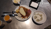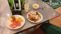 Завтрак - слева от входа варят 2 вида лапши, пельмени с овощами, жаренные яйца, типа драников оладьи, потом фарш, 4 вида тепа паровых пирожков/пельменей, жареный бекон. жареная лапша, колбаса, овощи, 2 вида каши, еще какие то нарезки, 2 вида фруктов, кофе, горячий шоколад из кофемашины, чай, сок не натуральный, и с аппарата йогурт очень вкусный, каждый день одно и тоже но есть что выбрать, голодным не останешься. На обед 2 вида супа, на любителя, и добавляется мясо, рыба, пиво в бутылках и водки китайская в графине, пару раз были креветки и гребешки.