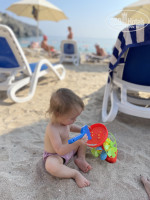 Море - супер 🥰 заход удобный плавный, с малышом можно спокойно поплескаться. У скал справа плавают разные рыбки и черепахи, правда вода мутная и видимость не очень, но я смогла разглядеть их немного. Маску обязательно привезите с собой. На камнях справа и слева от пляжа бегают крабики) Ближе к вечеру отлив, море на несколько метров отходит и начинается поиск ракушек)