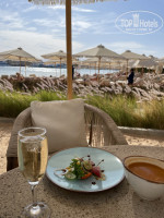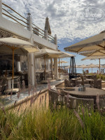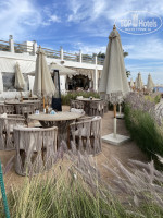 Пляж чистый, небольшой-шезлонги расположены близко друг к другу, и нет заборчиков от ветра. На пляже официанты разносят напитки, клубнику.