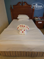 Номера довольно просторные, но видно, что мебель и интерьер уже устарели. В номере были чайник, две кружки, мини-холодильник (ежедневно пополняемый водой, спрайтом, колой и диетической колой в 1-литровых бутылках). В ванной комнате – гель для душа, шампунь, кондиционер, мыло, лосьон для тела и два стакана. Напор воды в душе был слабоват, но горячая вода всегда была. Фен и сейф работали исправно. Постельное белье белоснежное, уборка ежедневная, полотенца меняли, а на кровати выкладывали фигурки из полотенец.