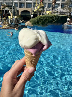 Возле бассейна пекут лепешки и мороженое в определеное время , очередь есть но небольшая , так как две женщины пекут .