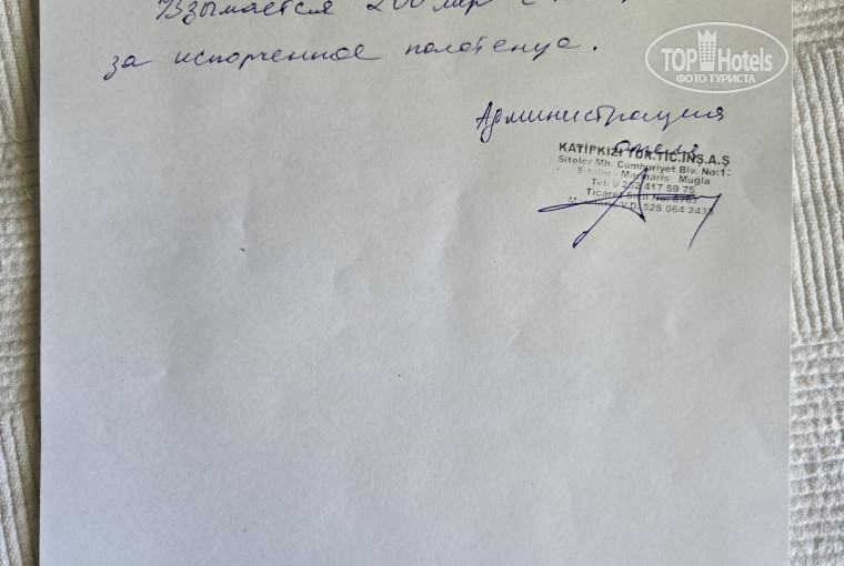 С первого впечатления отель не плохой. Номера по состоянию приличные, у нас был хороший семейный двух комнатный номер с двумя балконами, кондиционерами в каждой комнате и кухонным гарнитуром во второй комнате. Уборка ежедневно, замена белья раз в три дня. Питание так же приличное, было и мясо и рыба и курица. Зелень в наличии, огурцы с помидорами то же. Детям понравилась пицца и кебабы на палочках были даже бургеры, наличие фруктов скудное яблоки и апельсины, за то на завтрак большой выбор сыров а на ужин потрясающая пахлава и сладости. Анимации нет, так же как и собственного пляжа и полотенец для шизлонга. В целом в первые 4 дня оценивал отель на твердые 4,5 бала. Но есть неприятный нюанс, о котором просто кричат повсюду развешенные извещения на разных языках а именно наличие штрафов за испачканные полотенца и постельное белье. Нужно сказть что отнеслись мы с супругой к этим предупреждениям крайне серьезно и старались ни в коем случае ничего не испачкать или испортить. Но к сожалению как оказалось на 4 день отдыха, это ни на что не влияет. Проходя мимо рецепшена мы с удивсением услышали что достовно "Мы Вас уже несколько дней ищем с собаками, вот испорченое Вами полотенце. С Вас штраф 200 лир". Сказать что мы с супругой были сначала удивлены, а позже возмущены и расстроены так как оказалось что наши доводы о том что это полотенце никакого отношения к нам не имеет так как мы в курсе про штрафы из за чего даже косметикой от солца не пользуемся и точно знаем что ничего не пачкали абсолютно никому из администрации оказались не интересны. А потому мы ОБЯЗАННЫ заплатить штраф. Жена в шоке забрала непонятно кем и в чем испачканное полотенце и хотела его поробовать отстирать. Я с этим не согласлся и вернул его обратно, потребовав выдать мне бумагу о том за что с нас берут деньги. Бумагу такую мне надо сказать без проблем на ходу сочинили и выдали. На мое замечание что с гостями так поступать просто не прилично и я буду вынужден написать соответсвующий отзыв спокойно сказали "Пишите". После чего я был вынужден запретить убираться в номере и посещать его кому либо из администрации отеля в наше отсутствие. В общем наша оценка в 3 бала для гостиницы авансом, за описанные в начале плюсы, так как хостес и отношение администрации к гостям даже на 1 бал к сожалению не претендуют.