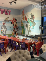 Для детей есть отдельный детский уголок в ресторане. Они там могут самостоятельно сидеть на детских стульчиках и есть отдельно от родителей.
