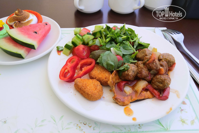 Выбор блюд огромный, каждый найдёт себе что-то по вкусу. Дают часто рыбу, курицу, индейку, была форель и был язык. Большой выбор фруктов, овощей: ежедневно дыня арбуз, яблоки, груши.
