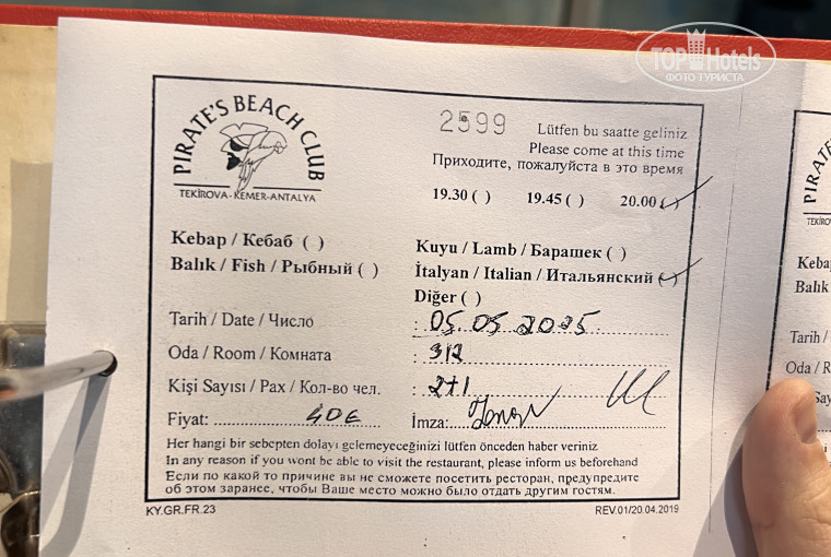 САМЫЙ УЖАСНЫЙ ОТЕЛЬ ЗА ВСЮ МОЮ ЖИЗНЬ! Были в Турции первый раз и поведение персонала в данном отеле напрочь отбило желание отдыхать в Турции. В этом отеле просто нереально много минусов,но начну с самого главного. Мы отдыхали с 04.05.25 по 11.05.25:я, муж и 5летний ребенок. А ля карта в данном отеле платная, менеджер отеля к нам как-то сама подошла и предложила записаться на ужин,запись как она сказала ни к чему не обязывала,попросила выбрать дату и время и поставить номер комнаты и поставить подпись, я уточнила ее а как же оплата,она сказала что потом в любой момент можно оплатить. Мы хотели заранее посмотреть какие блюда будут подавать на этом ужине,а потом уже принять решение идти или нет. Эта девушка ответила,что заранее посмотреть нельзя т к на данном ужине готовят только когда мы прийдем в ресторан и по меню выберем блюда и только тогда их начнут готовить. На следующий день мы познакомились с ребятами туристами(они были в Турции много раз) и посоветовали не тратить деньги на этот ужин,т к там еда особо отличаться не будет и будет такая же примитивная как и в бесплатном ресторане. Никто нам не говорил что нужно идти и отменять запись обязательно. Выезжали мы в 06:40 утра,на ресепшене был только один сотрудник,русскоговорящий (с акцентом)мужчина на вид турецкой национальности. Отдаем номерки и этот мужчина говорит что мы должны оплатить 40€ за ужин аля карт. Но мы же там не были мы говорим. Он отвечает,что это не основание и мы должны заплатить, т к мы подписали документ и повара ждали и приготовили для нас ужин(интересно какой если его мы д/б сами выбрать в меню). Я говорю что ничего мы не должны и описала,что их же менеджер говорил нам про ужин,что нас не предупреждали что если мы не отменим запись,то с нас возьмут плату. На что мужчина отвечает,что он не несет ответственности за девушку. Я попросила связаться с человеком,кто несет эту ответственность,он сказал что никто не несет. Ситуация начала накаляться,за нами уже приехал трансфер от тура. Мужчина повторял одну и туже фразу:вы подписали документ,я говорю покажите этот документ(фото его прикладываю). Он в руки эту квитанцию (так сказать)мне так и не дал,и я ему зачитываю из его же рук,что там написано:предупредите пожалуйста если не подойдете. Никаких штрафов там не было указано. Я опять ему говорю что платить мы не будем,на что он отвечает что решать Вам,просто тогда вы пропустите свой рейс и сообщает охране,чтобы они перекрыли проход нам. Мы просто в шоке,я говорю вы знаете что вы вымогаете деньги путем шантажа,он говорит мне все равно,т к вы заплатите мне 40€. Муж уже выходит из себя начинает на него кричать…на что мужчина просто начинает покрывать моего мужа МАТОМ ПО-РУССКИ…это как вообще нормально,что с руководством этого отеля???Я говорю ему прекратите покрывать нас матом и звоните своему директору,он говорит что звонить никому не будет т к сейчас очень рано,управляющего у них нет и что он сейчас самый главный,что он директор сейчас и нет смысла звонить никому,т к такое у них каждую неделю…ну…развод туристов вот такой каждую неделю. За нами уже зашла девушка гид до аэропорта,сказала ему тоже что он не прав,так он начал на нее орать:ты за кого вообще за меня или за них. Из-за этого хаоса,не выпускали из отеля ребят,которые тоже с нами должны добираться до аэропорта…По итогу мы уже опаздывали и п
