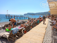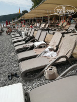Пляж. Калитка к пляжу работала с 8 до 19 часов. Пляж узкий, метров 150 в длину. Некоторые пишут что мелкий песок. Неверно - мелкая галька (коралки обязательно). Лежаки стоят в плотную. Три ряда под тентом и три на солнце. Вход почти сразу глубина. Около 10 утра мест становится мало, но на галерке в тени всегда есть. Постоянно ходит человек и предлагает водные развлечения (катер, гидроцикл, парашют). Бар работает быстро и качественно - еда и напитки: салат, фрукты, бургеры, шаурма, наггетсы, картофель фри. Готовьтесь к тому, что на пляже не будет интернета. В один из дней небольшое волнение. Спасатели на месте.