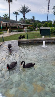 Территория отеля просто громадная, я не знаю даже какой отель сравнится с ее площадью, мы за неделю не всё обошли и посмотрели. Всё очень ухоженно, плиточку натирают машинами, цветочки поливают, кошечки довольные и упитанные, бассейны чистейшие (2 подогреваемые). Озерцо с водопадом и фламинго, лебедями – это отдельная фишка, не надо ехать на Мальдивы, приезжайте сюда. Я каждый день смотрела на фламинго и умилялась красотой этих птиц. Кушать на открытой террасе с видом на такую красоту – это особый вид удовольствия. С другой стороны – черные лебеди и по вечерам прилетает аист, у него свито гнездо на пальме.