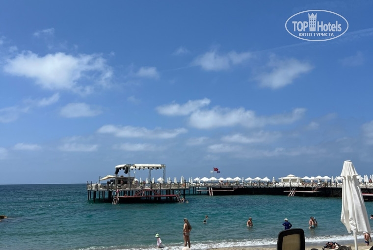 Пляж компактный и что сильно обрадовало - песочек и вход приятный, для нас это самое то - у нас ребенок 3 года. На пляже есть пирс, который вечером превращается в дискотеку. Море чистое, пляж усердно убирают. На пирсе есть кафе - арбузы, коктейли, нагетсы и тд.