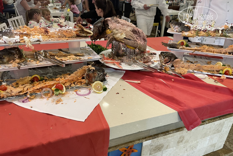 ❌ Питание– **очень однообразное**. Если приходить не к открытию ресторана (например, в 19:00), мяса и рыбы уже не будет. Остаются только кости и булки.