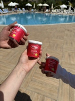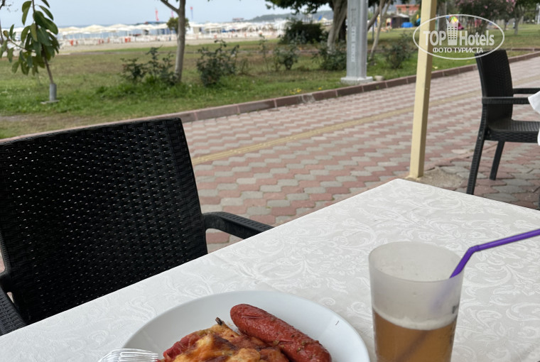 В баре у бассейна делают коктейли, пиво Эфес, вино сухое, шампанское, крепкий алкоголь не пробовали. Вода в барах в индивидуальных упаковках (стаканчик 200 мл). На пляже коктейли не делают, но есть пиво, вино, вода, кофе, горячий шоколад, чай, айран. В 11 там готовят вкусную пиццу. Еще есть бургеры, хот-доги, картошка, овощи, фрукты. А у бассейна в это время лепешки с начинкой.