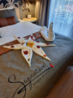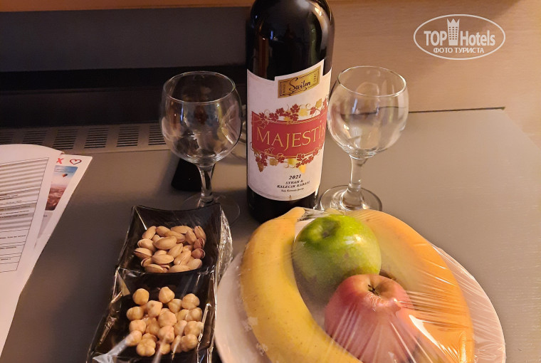 Нам дали номер с видом на море, как и бронировали. В номере были приветственная бутылка красного вина, фрукты, орешки. Очень приятно! В номере есть сейф, 2 зеркала в полный рост, много места в шкафу, халаты и тапочки тоже есть. Мини-бар заполнен (вода, минеральная вода, холодный чай двух видов, кола, спрайт, фанта, пиво две бутылки, чипсы, вафли). Чипсы и вафли только в день заезда. Остальное пополняли каждый день. В номере есть всё необходимое. Из банных принадлежностей есть мочалки, зубные щётки с пастой, бритва с гелем для бритья, расчёска, ватные диски, ватные палочки, пилочка для ногтей, мыло, шапочки для душа, шампунь, гель для душа, кондиционер для волос (плохо увлажняет волосы, лучше взять свою любимую маску для волос), крем для тела. У нас была двуспальная кровать + односпальная. Матрас и подушки удобные. Кондиционер хорошо работает, не сильно шумит, на кровать не дует. Напор воды хороший, горячая вода всегда была. В номере также есть чайный уголок: чайник, 4 чашки, кофе, сливки, чай разный, сахар белый и коричневый. Соседей не слышали, хотя они точно были, в номере тихо. Дверь на балкон тоже очень хорошо изолирует звук с улицы (под окнами был детский аквапарк). Уборка ежедневная, хорошая. Ещё в номере есть швейный набор (иголки, нитки разных цветов, несколько пуговиц и булавка).