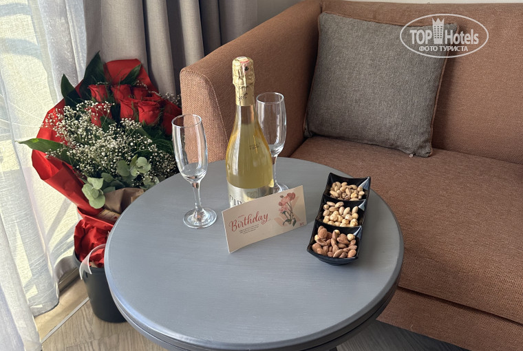 Отдыхали семьёй.. Здесь я отметила свой день рождения. К нам приезжала наша сестра, отель очень понравился, в целом все хорошо, понравились номера, нам попался номер с видом на море, что очень порадовало нас.
