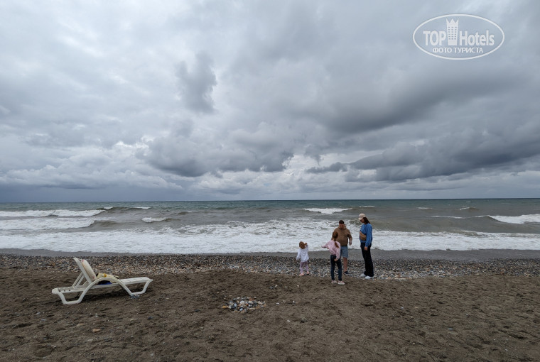 На пляже галька, есть большие булыжники, плиты. Тапки не покупал, но заходить крайне не комфортно, покупайте обязательно обувь. Погодка была переменчивая и у пляжа загорать не приходилось, так что не могу сказать как там в сезон.