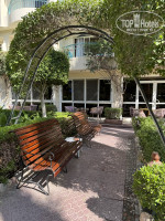 Территория маленькая, уютная и очень зеленая. Каждое утро за ней ухаживают, подстригают и поливают. Идеальная чистота. Она вся наполнена лавочками, беседками, столиками, теневыми зонами. Очень курящий отель, поэтому все сидят курят и пьют пиво.