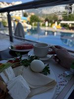 На обед ходили редко, так как есть бар на пляже. Основное время проводили там. На пляже делают бургеры, картошка, иногда лаваши с творогом, иногда пицца. Напитки в баре на пляже пиво, цветные всякие безалкогольные напитки, можно сделать чай. Синан в баре на пляже. Ему привет. Галантный парень. С колонкой , с музыкой, со своей собачкой, со своим фотоаппаратом моментальной печати) , всегда цветами украшал барную стойку. Ему огромное спасибо за атмосферу! Один день у него был выходной, так не было ни музыки, ни настроения, ни обслуживания нормального.
