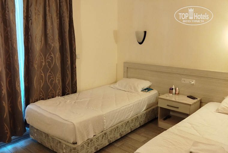 Мы жили в доп корпусе, номера аскетичные, но всё есть: тв, кондей, холодильник, горячая вода - хороший напор, чистое белье и полотенца, смена и уборка раз в три дня. Нет мыльных принадлежностей, есть одноразовые тапочки. Пляжные полотенца - свежие , новые за депозит 5 долларов, который возвращают. Питание очень простое, без изысков и разнообразия, но хорошее, четырех разовое вместе с полдником. Много зелени, салатов, вкусные супы, сладости, каждый день были сочные арбузы, два-три вида гарнира, одно основное блюдо - курица/котлетки/наггетсы/гуляш-рагу из курицы. На завтрак чередуются менемен/омлет/яичница/вареные яйца. В течение дня в свободном доступе чай, кофе, газированные напитки, соки из автомата, вода, пиво, домашнее вино. Собственник отеля местный турок, который вместе с семьёй и наемным персоналом обслуживает отель, контролирует и внимателен к запросам постояльцев. Персонал отзывчив. Заселение в 14.00, сдача номеров в 12.00 - в высокий сезон соблюдается во всех отелях, просто потому что отель под завязку и свободных номеров нет. Где-то пишут, что даже на территорию не пустили раньше двух, на мой взгляд, это вопрос коммуникации, как вы - так и к вам, при нас несколько раз видела, как надевают браслеты тем, кто приехал раньше, и просят оставить багаж на ресепшен, заселения подождать. Мы сами освободили номер в 12.00, покинули отель позже, никто с нас браслеты не снимал, то ест мы продолжали пользоваться сервисом отеля и кушали пили, пока его не покинули.