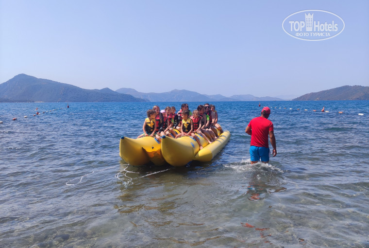 По отдельным дням приходит прогулочный кораблик с 10-16 возит по островам. Стоимость 60 евро с человека. В прошлом году мы отдыхали в отеле Язиси (в районе Мармариса) и такой кораблик стоил 35 долларов и ходил каждый божий день. Условия те же, только нет такой туевой тучи народу! Мы все размещались на лежаках, внизу было много места. Здесь же пользуются тем, что нет конкурентов и лупят цены. Ждут, когда народ наберётся, как сельди в бочке по 80 человек.