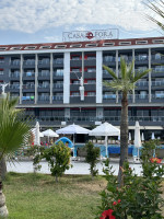 Красивый , многоэтажный отель с наружи, внутри похуже, номера неплохие, удобная кровать, есть мыло, шампунь, тапочки, ушные палочки. добродушный персонал. бесплатный wi-fi на всей территории . Питание на 4-ку, напитки местные и импортные, пиво. В баре минимальная коктейльная карта, витрин с бутылочками нет, видимо секрет . К открытию ресторана на завтрак приходится ждать, когда повар нажарит блинчиков, омлетов и тд, те персонал не готов и лучше приходить на час позже. К обеду и ужину все готово. Очень грязные стаканы (жирные поддетеки после посудомойки), кофе и чай оставляют желать лучшего. Управляющий делал замечания персоналу, но это не помогло. Помимо основного ресторана в обед в баре у бассейна и на пляже можно перекусить бургерами, пиццей, овощами, снэками , фруктами, мороженым и т.д. Кондиционер работает на 5+ и в номерах и в фойе и в ресторане. Анимация была, дискотека, караоке. Все компактно и в шаговой доступности. Уборка и чистота в номерах и здании оставляет желать лучшего на слабую 3-ку. Мусор выносили редко, бумагу пришлось добывать, было ощущение, что в вещах что-то искали, но ничего не нашли 🤣. Жирная пятерка пляжу. Широкий красивый пляж, два аквапарка : детский и взрослый, безопасное покрытие около аквапарка, ухоженная территория, много лежаков, при чем свободных. Доступные цены на spa , огромное спасибо за хаммам. Вернусь, если ценник будет для 4-ки 👍.