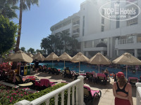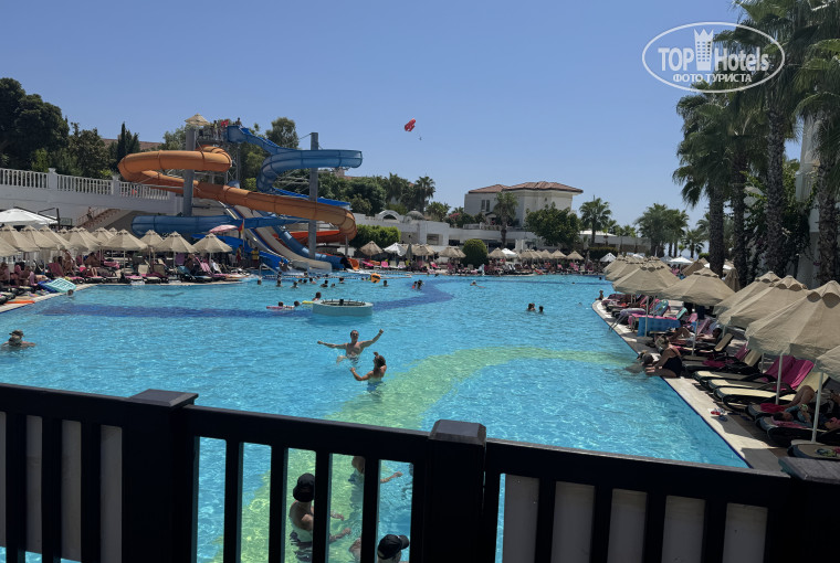 Бассейн один, вокруг него вплотную друг к другу лежаки и зонтики. Если не успели занять место до 8 утра, то найти хотя бы один лежак будет только после 5 вечера. Конечно, написано, что так делать нельзя, и администрация вправе забрать полотенца, но никто этим правилам не следует. В бассейне 4 горки, за горками маленький бассейн для малышей.