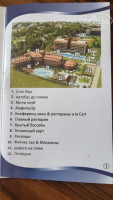 На ресепшен подошли из нашего автобуса 5 семей, русскоговорящий сотрудник собрал паспорта и ваучеры, второй сотрудник надел браслеты и предложил воспользоваться услугами бара пока не вызовут. Минут через 10 по фамилиям подозвал представителя каждой семьи, выдал карту от номера, карточки на пляжные полотенца и буклетик со схемой (на фото) и расписанием работы баров и столовой. Все очень быстро и профессионально.