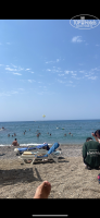 В 8 утра мест уже не было нигде. Лежаков не хватает катастрофически. Люди просто лежали на полотенцах на берегу моря. Есть плиты прям рядом с берегом и чуть подальше. Если проплыть, то там можно встать и стоять. Пляж галечный, Галька не крупная. Пляжные полотенца не предоставляются. У бассейна лежаками с зонтиками, на море над лежаками натянут тент, пляж не огорожен буйками в море. Пляж грязный, его совершенно не убирают. Есть один душ и 2 раздевалки. Уборная комната находится в корпусе у моря ( 2 минуты пешком от пляжа).