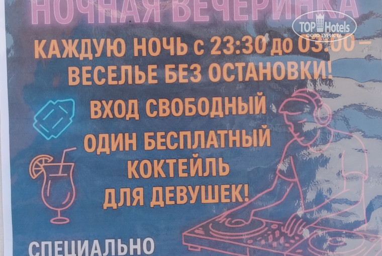 Дискотека на пляже не только для отельных,DJ сказали меняется каждые 15 дней,но DJ назвать его сложно,сложилось впечатление,что просто приходил на работу послушать свою музыку,она не клубная просто попса,при просьбе что то поставить клубное,активно сопротивляться,приходилось просить мужчин,им он не отказывал))),но до 3х работал и бар тоже,что бывает не часто отелях. Минус,что в туалете в это время не было туалетной бумаги,ну и не хватало там крючков и опять чистоты.