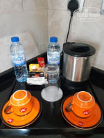 Чайник с чашками и блюдцами в номере есть. Чай-кофе и сахар, а так же две бутылочки воды по 0.5 литра пополняли ежедневно.