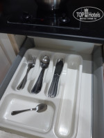 Вся мебель в хорошем состоянии, кровать большая и удобная. Постельное мягкое и белоснежное. Шкаф-купе, правда, подкачал: плохо закрываются и открываются дверцы. Отдельный разговор это кухонная мебель. Очень потрёпанная жизнью.🙃 Но индукционная плита работала, вода горячая в кране была, холодильник холодил и морозил продукты, как надо. И холодная вода тоже была. Из посуды кастрюлька в виде ковша с крышкой, огромная сковородка с крышкой, четыре огромных тарелки, ложки-вилки, всякие черпаки и почему-то одна чайная ложка. Мы всем пользовались, так как питание не брали.