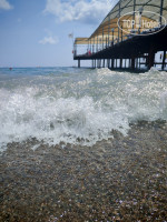 Пляж, действительно, камни, галька, песок. Вход в море в первый день показался проблемотичным. Но потом мы поняли, что слева, около соседнего пантона, камней нет совсем. Входили там. На дне и песок, и камни чуть дальше. Половину отпуска море было спокойно, половину волны. Но не такие, которые сбивают с ног, как допустим в Сиде в это время. А можно прекрасно покачаться на волнах на круге или матрасе. 1-2 дня прилив, 1-2 дня отлив. Пару раз приносило мусор волнами с моря. Но только у берега. Дальше вода чистая. Море очень тёплое. Можно входить в воду по лесенке с платформы. Там же есть душ для обмывания. Он же есть и на пляже. Лежаков хватало всегда. Хотите под солнцем, хотите под навесом. Перед обедом пляж вообще пустел. Смысла занимать лежаки никакого нет. Мы приходили часам к 10.00.Всегда есть пустые места. И много. То же у бассейна.