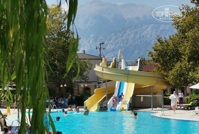Отель расположен в красивом месте у подножья гор, которые вечером красиво подсвечивают. Территория хорошо спланирована и ухожена. Есть два бассейна для взрослых и горка, маленький бассейн для детей. Вечером гостям разрешается плавать в бассейнах.. Я ходила вечером на море).
