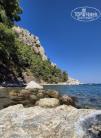 Пляж достаточно чистый, имеется душ и сотрудник отеля, который бдит за тем, чтобы отдыхающие мыли ноги и обувь от песка, прежде, чем подняться в бар и бассейн. Есть пирс под навесом. Лежаки - сетка, в нормальном состоянии. Урны присутствуют, но есть отдыхающие, которым на них плевать((( Береговая линия - песок с крупной галькой при заходе в воду. Мы обходились без обуви, практически сразу глубина. Слева вход поудобнее. Но и для маленьких деток есть где побулькаться. Лежаки занимались практически с 6 утра, но даже после завтрака (часов в 9-10) можно было найти места.