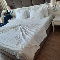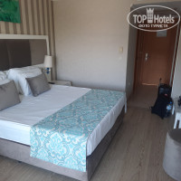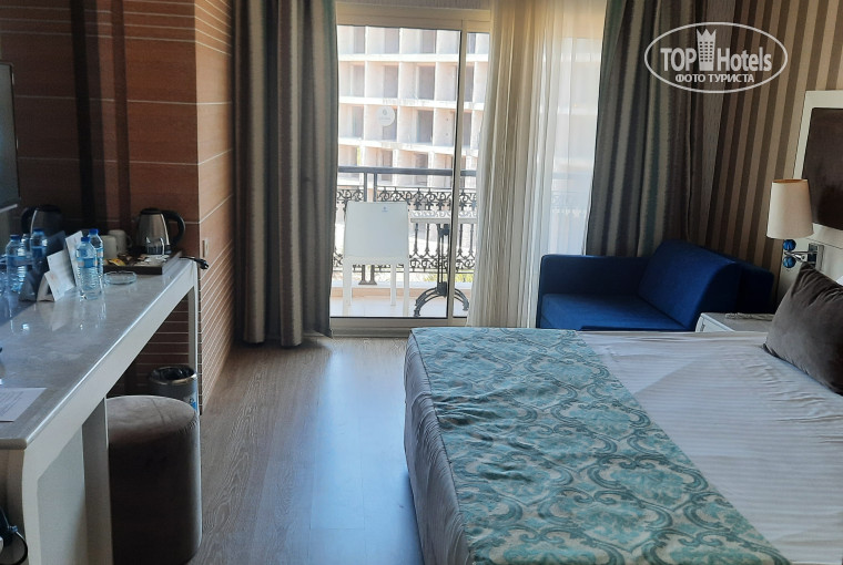 Номер. Получили свой лэнд-вью с видом на постоянно пустующие корты соседнего Али Бей отеля, с видом на строящее здание соседнего отеля. Всё работало, холодильник холодил, мини-бар пополнялся невзирая на невыпитую воду ))) В санузле душ и т.д. Полотенца меняли каждый день, пару раз меняли постельное белье, каждый день влажная уборка полов, песка, камешков на полу никогда не было. Пыль не заметил. Телевизор работал, но смотреть абсолютно нечего - русские каналы (ТНТ в разных вариациях) смотреть невозможно, а иностранные только если спорт и музыка, да, собственно, и некогда. Да, слышимость хорошая, но так уставали отдыхать, что не обращали внимание. Присутствует чайный столик с чайником, кофе и чайными пакетиками, есть пакетики с сухими сливками. Стройка соседнего отеля постоянно не функционировала, воспринимали его как какие-то античные руины. Очень красивый вид на горы, облака над ними, завораживало. Как минус, солнце на болкон попадало только утром, поэтому вещи сохнут долго. Там же на балконе есть стол стулья и вешалки для белья.