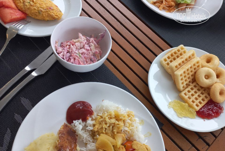 Завтраки в отеле достойные, однообразные, но за 18 дней выбирали разные блюда, и нам не надоело. Омлет, яичница, том ям, том кха, драгон,ананас,папайя, овощи и вафли. Кофе в кофемашине сначала был вкусный, потом - отстой, не знаю, от чего зависит - вероятно, закупили какую-то робусту и пить было невозможно.