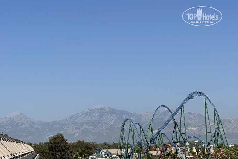Вид с пятого этажа просто божественный, видно и парк легенд (о котором чуть позже) и бассейн и горы в дали