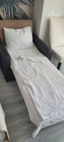 При бронировании просили одну двуспальную кровать. Отель предоставил две кровати рядом, соединенные единым постельным бельем. Нас не напрягало. Для ребенка раскладное кресло. Одеял и простыней (укрываться) нет. Предоставлены белые покрывала, на двоих взрослых одно большое, ребенку, соответственно, поуже. Не знаю, как часто их стирают, но на вид выглядели чистыми. Индивидуальная сплит-система.