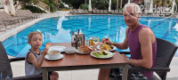По мне, питание на 5. Кому надо каждый день крабов и королевские креветки, вам не сюда. Очередей ни за чем нет. В обед к столикам подходят официанты для заказа напитков. Обслуживание быстрое. На обед и ужин большой выбор десертов. Из фруктов были очень сладкие арбузы, дыня, яблоки, груши, виноград (черный и белый), персики. В ужин всегда мороженое. В снек-баре невкусное гёзлиме. За 9 посещение Турции впервые с таким столкнулась.
