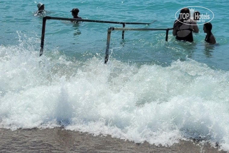 С территории отеля сразу попадаешь на пляж. Пляж песчаный, вход в море мелкая галька. Большой минус – рядом сточная труба. Пару раз при нас из неё был слив в море. На вид вода чистая, но запах канализации присутствует. В остальные дни его не было.