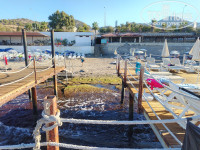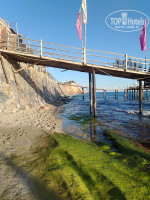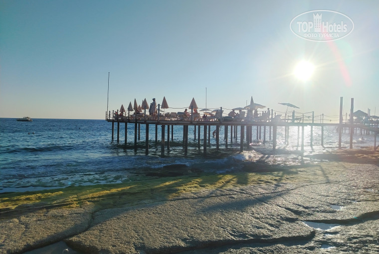 - Пляж: море ШИКАРНОЕ, а вот попасть в него целый квест. Если стоять лицом к морю, то слева в 100м есть кусок песчаного пляжа с хорошим заходом (но без зонтов и лежаков!), но чтобы к нему попасть, надо пройти либо впритык к скале по камням (и только в обуви!), либо по винтовой лестнице подняться на дорогу, пройти по ней и спуститься через пляж другого отеля. С пирса есть лестница из металлических труб, по ней спускаешься сразу в море, где глубина метра два. На пирсе постоянная нехватка лежаков, и тем более зонтов. На берегу на пляже лежаков с зонтами ещё меньше, к тому же там постоянно воняет. Позагорав один день на пляже, мы стали вставать в 6ч утра и бежать на пирс, чтобы занять лежаки. И на пирсе, и на пляже практически никто не убирает, утром приходишь и убираешь разбросанные стаканчики и мусор после чьих-то вечерних гулянок.
